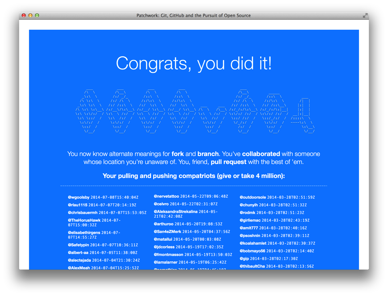 プルリクエストまで到達すると成功者の名前がリストに掲載されるご褒美も待っています。GitやGitHubの使い方を身につけたい方はためしてみてはいかがでしょうか。