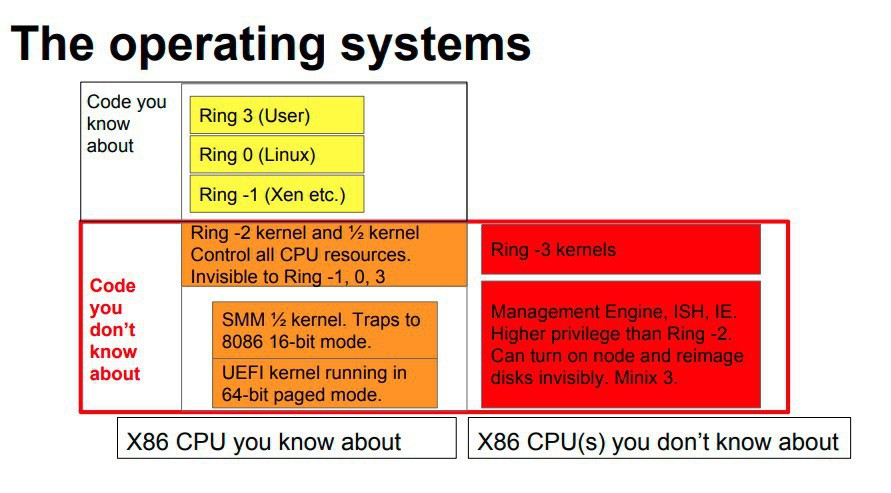 Minixは「Ring -3」と呼ばれるユーザーからはアクセスできない最上位の特権状態で動作し、一般カーネルが動作する「Ring 0」よりもさらに上のレベルで完全にコンピューターを制御することが可能になっているようです。