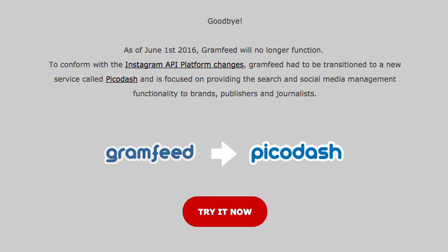 Goodbye! As of June 1st 2016, Gramfeed will no longer function. To conform with the Instagram API Platform changes, Gramfeed had to be transitioned to a new service called Picodash and is focused on providing the search and social media management functionality to brands, publishers and journalists.
