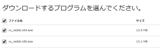 検索してみたところ、このエラーは「Visual Studio 2015 の Visual C++ 再頒布可能パッケージ」をインストールすると修正されるという情報がみつかりました。Microsoftのサイトのダウンロードリンクをたどり、以下の2つのファイルをダウンロードします。