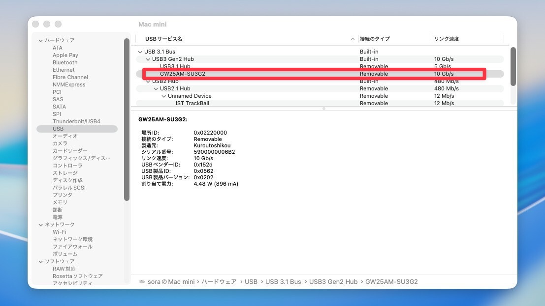 ケースにSSDを装着してMacに接続。macOS の「システム情報」から確認したところ、USB 3.2 Gen2のリンク速度(10 Gb/s)で認識していることが確認できました。