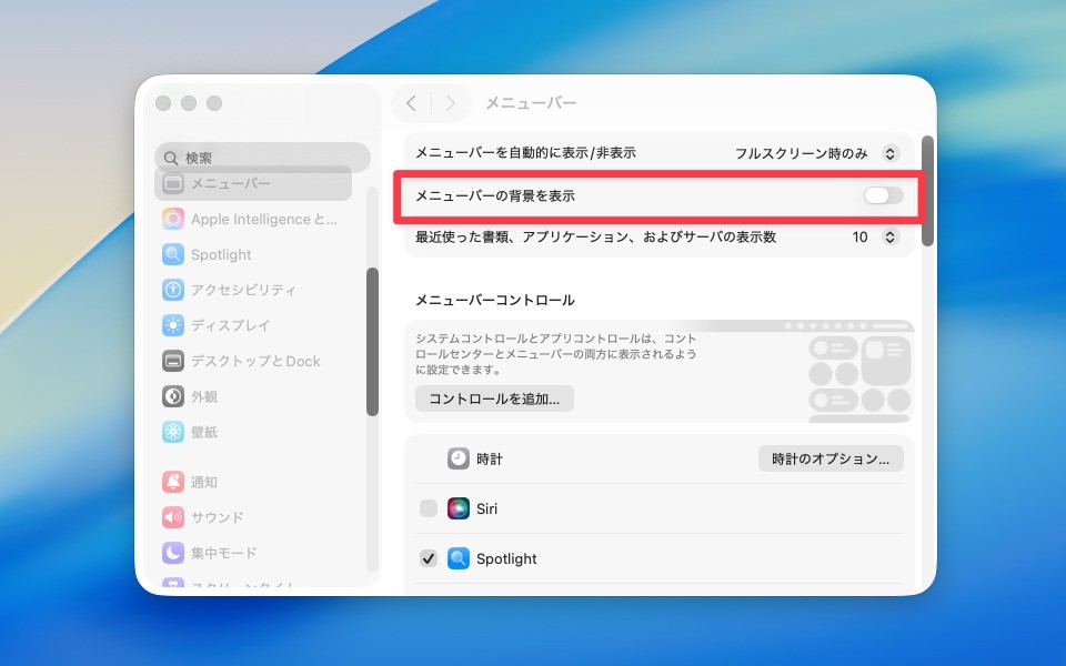 なお、macOS Tahoeでは透明メニューバーが有効になっており、Iceの「Menu Bar Appearance」設定を有効にすると、メニューバーの背後の領域の明るさが不自然に見えることがあるそうです。メニューバーの背後だけが妙に暗く見えたり、壁紙やウィンドウの色が不自然に変化して見えることがあるそうですが、これはmacOSの「メニューバーの背景表示」オプションを有効にすることで軽減できるとのこと。