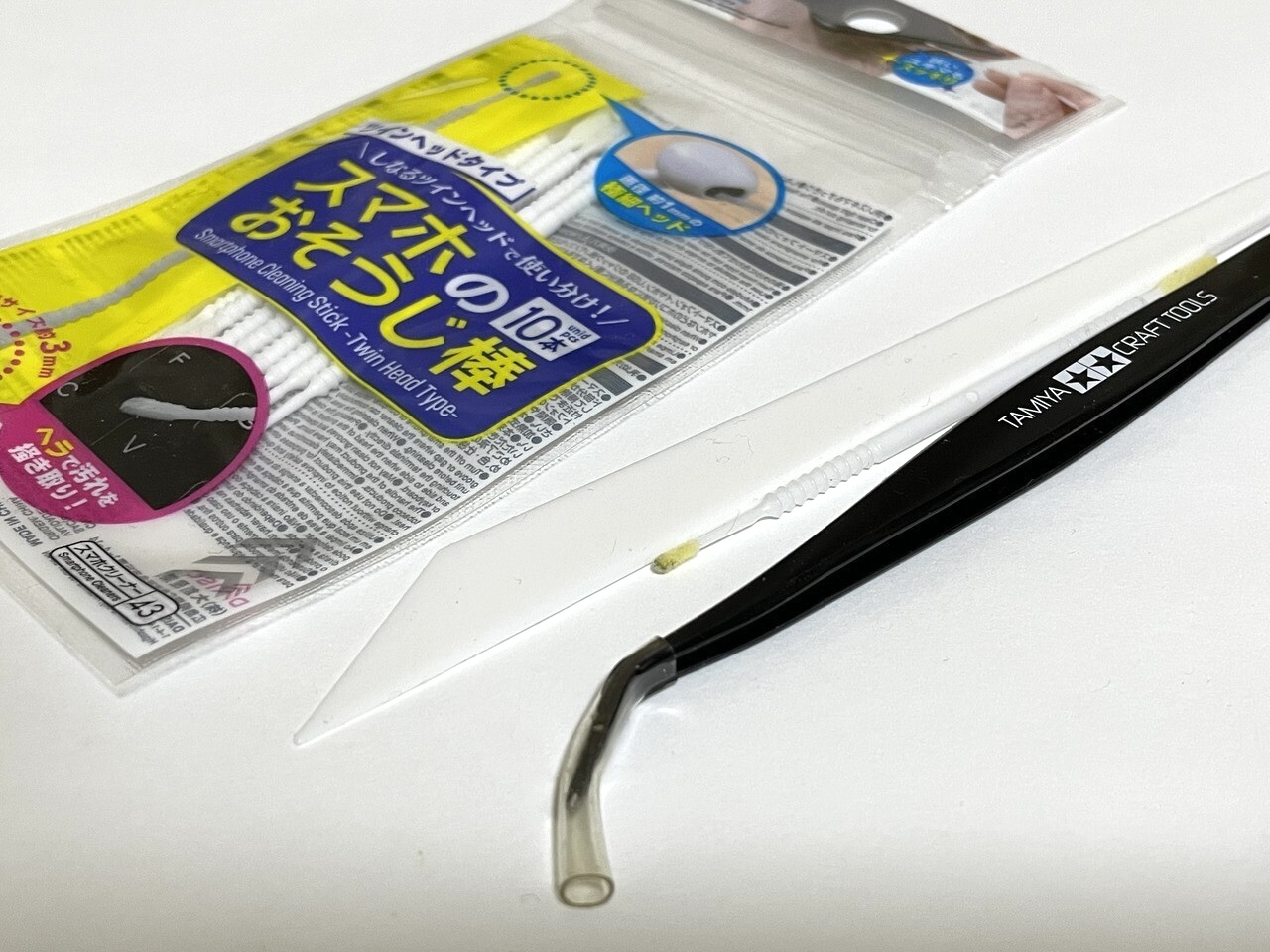 ▲ダイソーで購入した「スマホのおそうじ棒」と「ヘラ」。さらにもともと持っていたピンセット(タミヤ製)です。