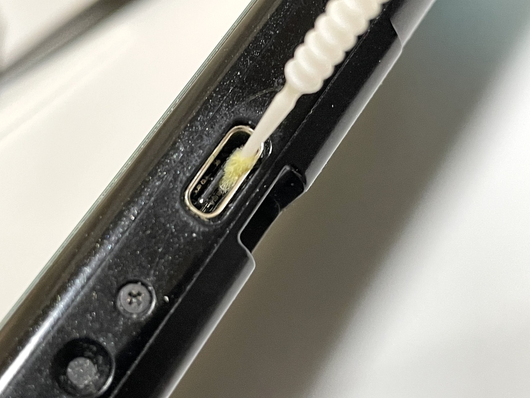 ▲なおこちらは確認しただけですが、USB-C端子の場合、真ん中にある出っ張りが邪魔でスマホのおそうじ棒は奥まで入らないようです。もう少し細い何か(針とか?)を使った方が良さそうです。