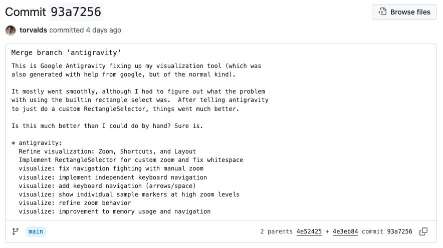 コミットメッセージによると、Linus氏はGoogle Antigravityを使ってPython製の可視化ツールの改善を試みた模様。「手作業よりずっと良い」とコメントするほど、スムーズに開発が進んだようです。