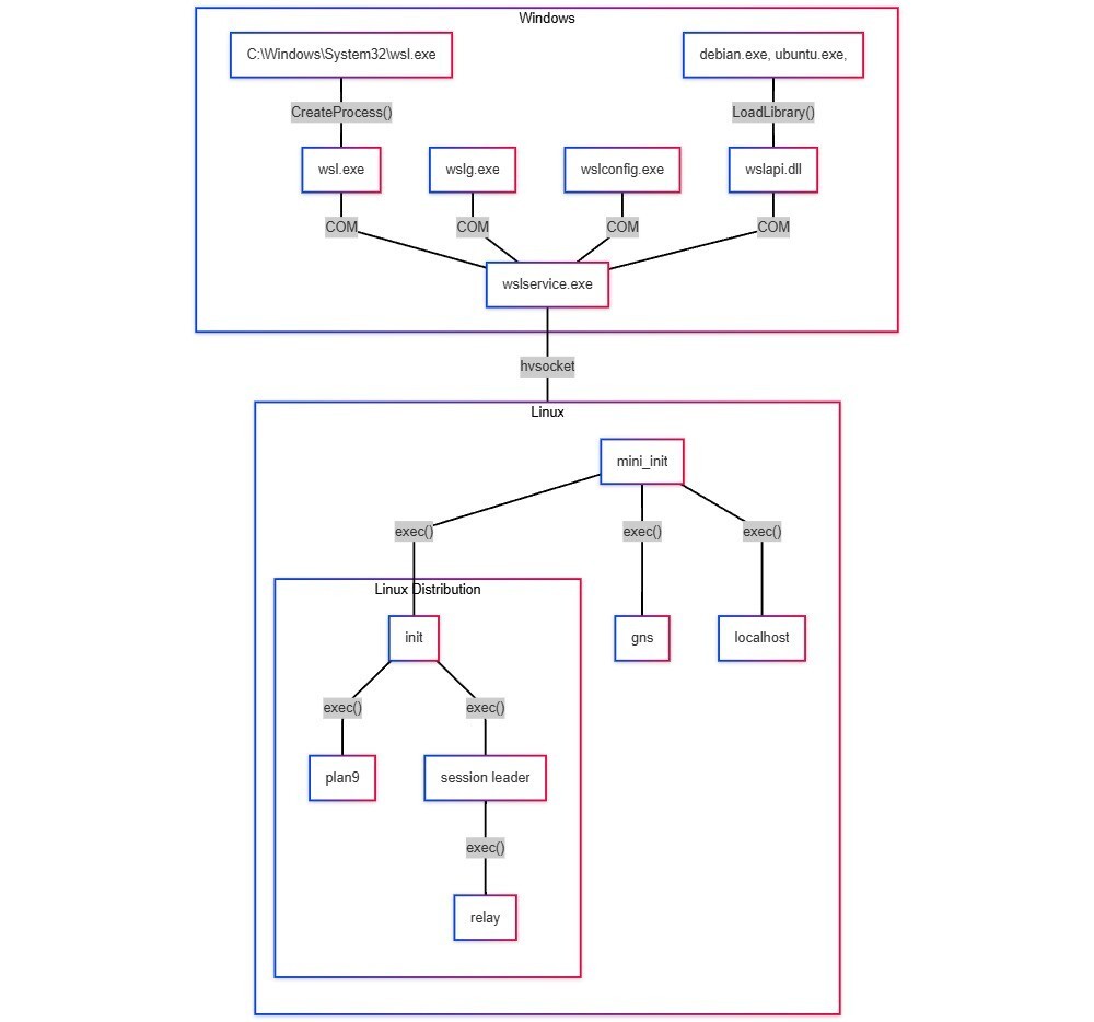これは長年にわたる開発の成果で、WSLのコードがGitHub上で公開されれることにより、コミュニティが自由に利用・改良できるようになります。WSLのアーキテクチャには、Windows上で動作するコンポーネントと、WSL 2の仮想マシン内で動作するコンポーネントが含まれています。