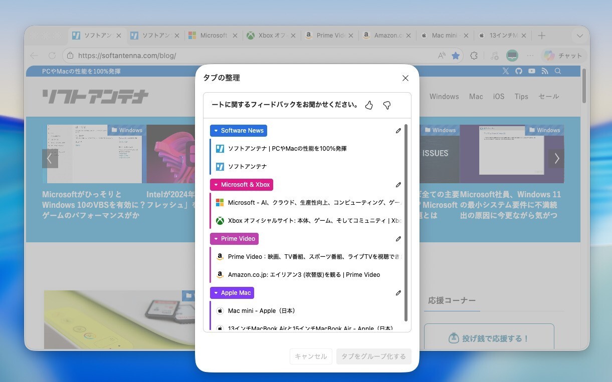 例えば、Microsoft Edgeに新しく追加されたAIによる自動タブ整理機能は、タブを大量に開きすぎて整理できなくて困っているヘビーユーザーに特におすすめの機能です。