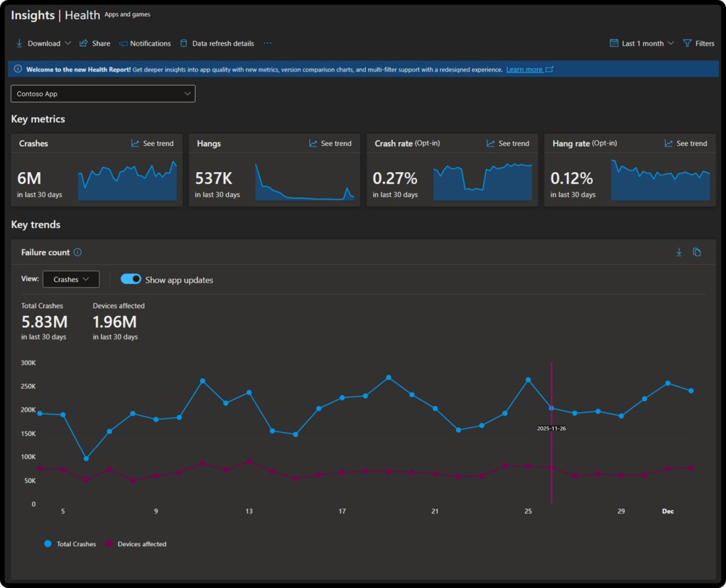まず、Health Reportsの強化が行われ、アプリの安定性をより深く分析することができるようになります。バージョン、デバイスアーキテクチャ、OS ビルドなど複数条件でフィルタリング可能で、クラッシュやハングの傾向が把握しやすくなります。