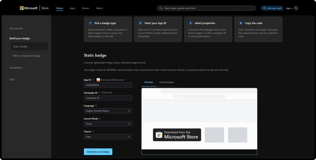 Microsoft Store Web Installerもアップデートされ、Win32アプリの自動起動に対応し、より多くのエンタープライズ管理デバイスでインストールを完了できるようになりました。公式バッジを簡単に生成できるStore Badge Creatorの刷新も行われています。