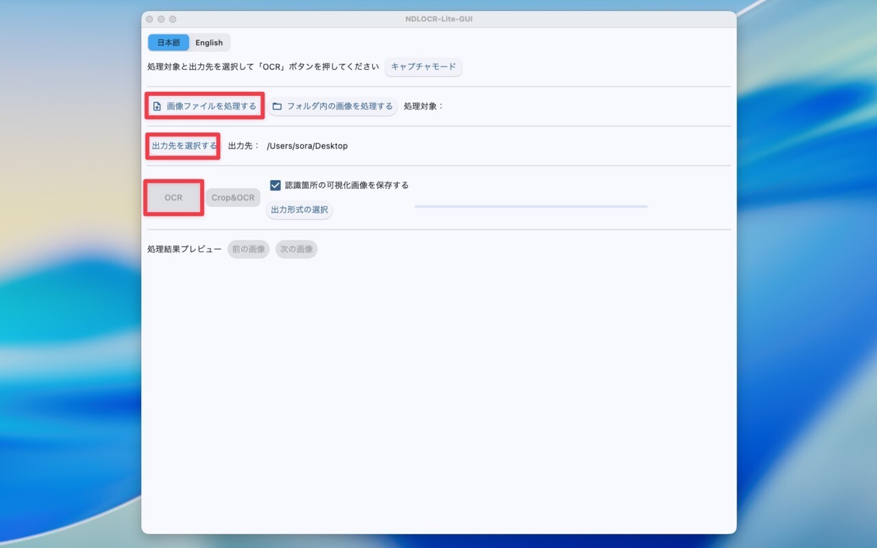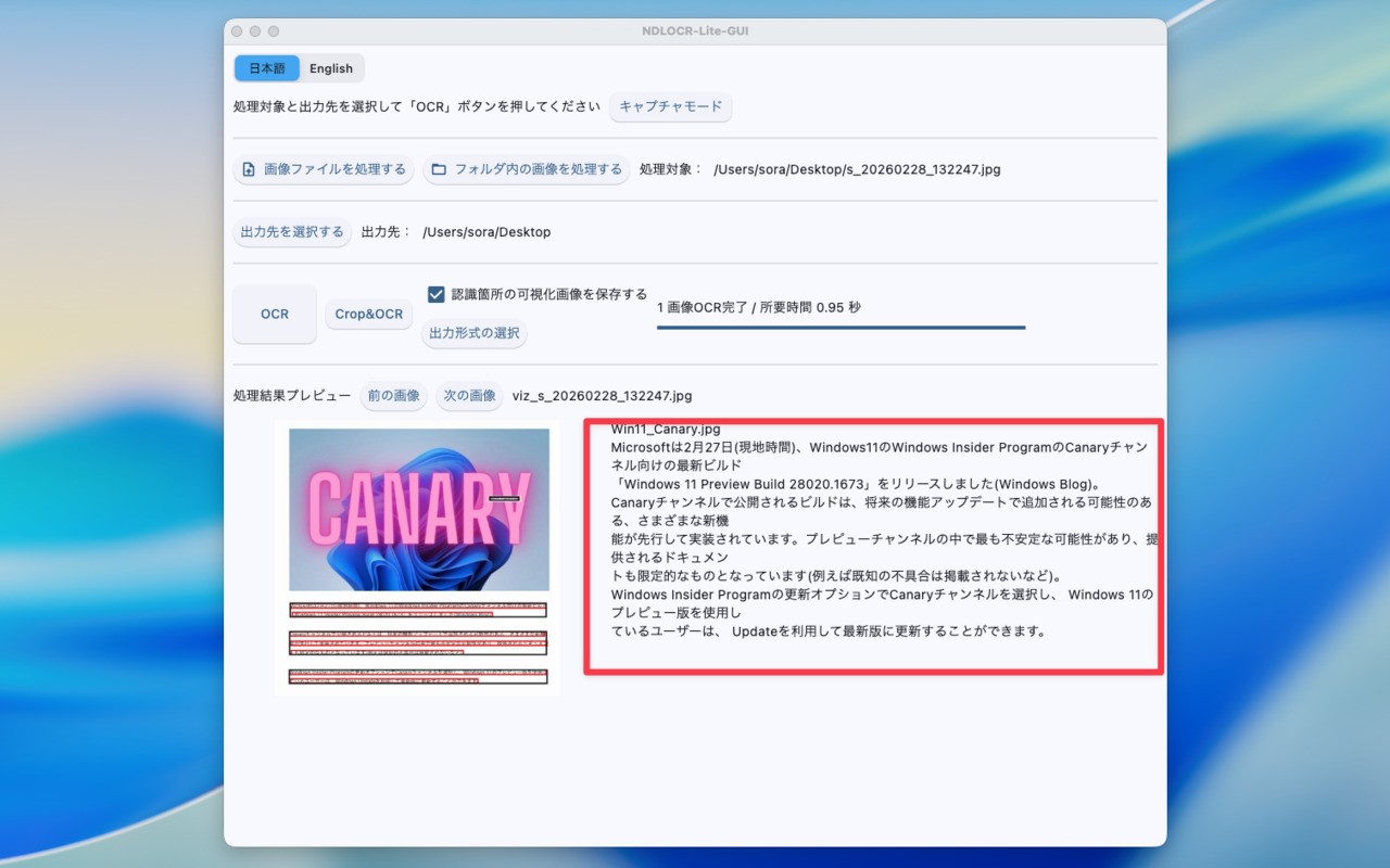 ▲「画像ファイルを処理する」で画像ファイルを選択し、「出力先を選択する」で、処理結果の出力先フォルダを選択します(処理結果として、画像、xml、json、txtファイルが書き出されます)。「OCR」をクリックすると処理結果が表示されます。