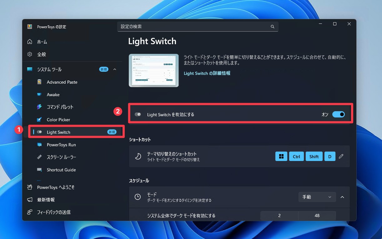 修正版が待てない場合、PowerToysの「LightSwitch」の定画面を開き、「オフ」にすることで回避可能です。