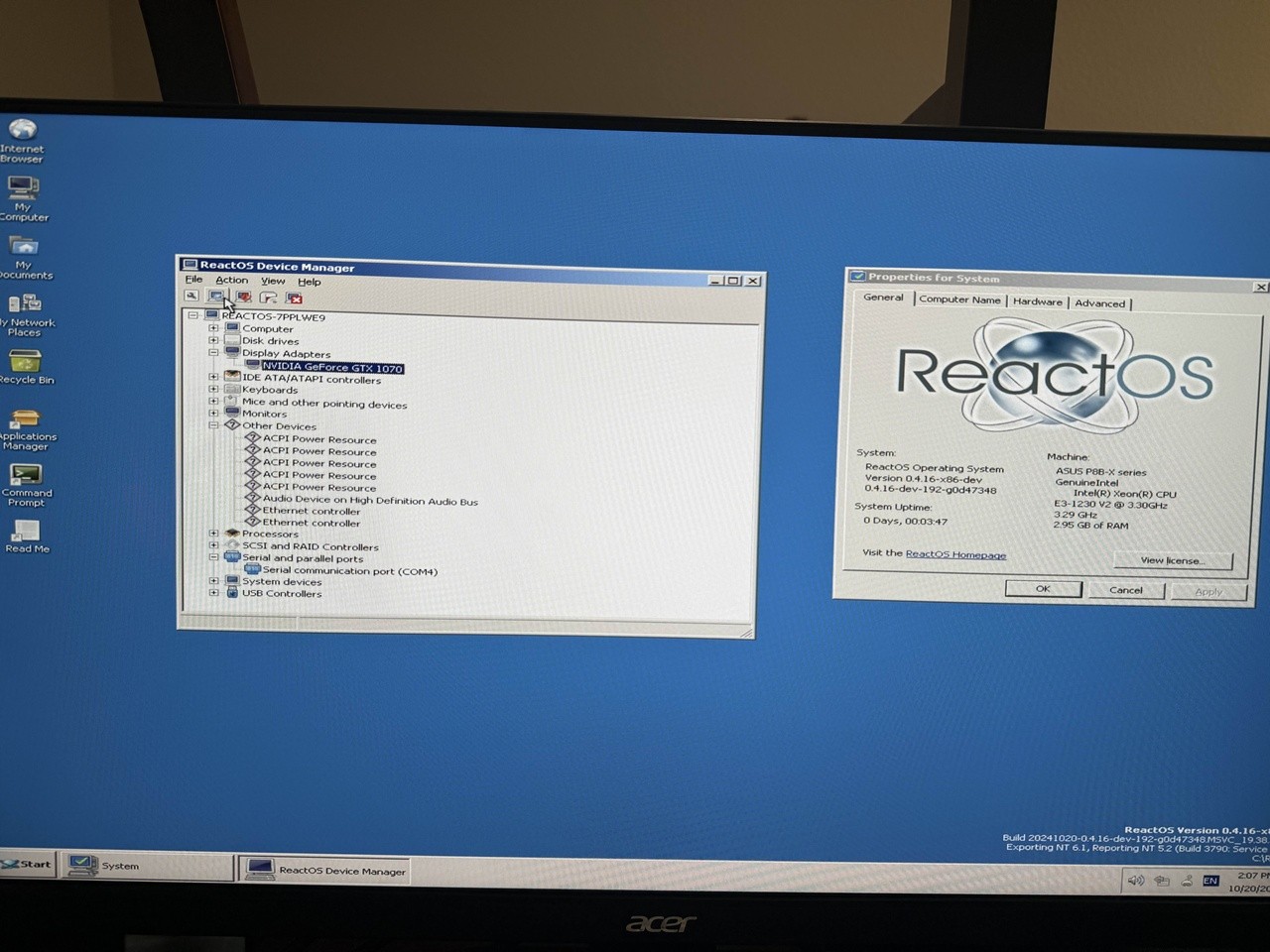 その結果、より多くのドライバで何らかの表示を出せるようになり、ReactOSが最新のモニターでフル解像度・高リフレッシュレートを扱えるようになってきました。ただし、すぐに限界を感じたのはWin32kの実装ではなく、ReactOS自体のハードウェア対応力でした。」