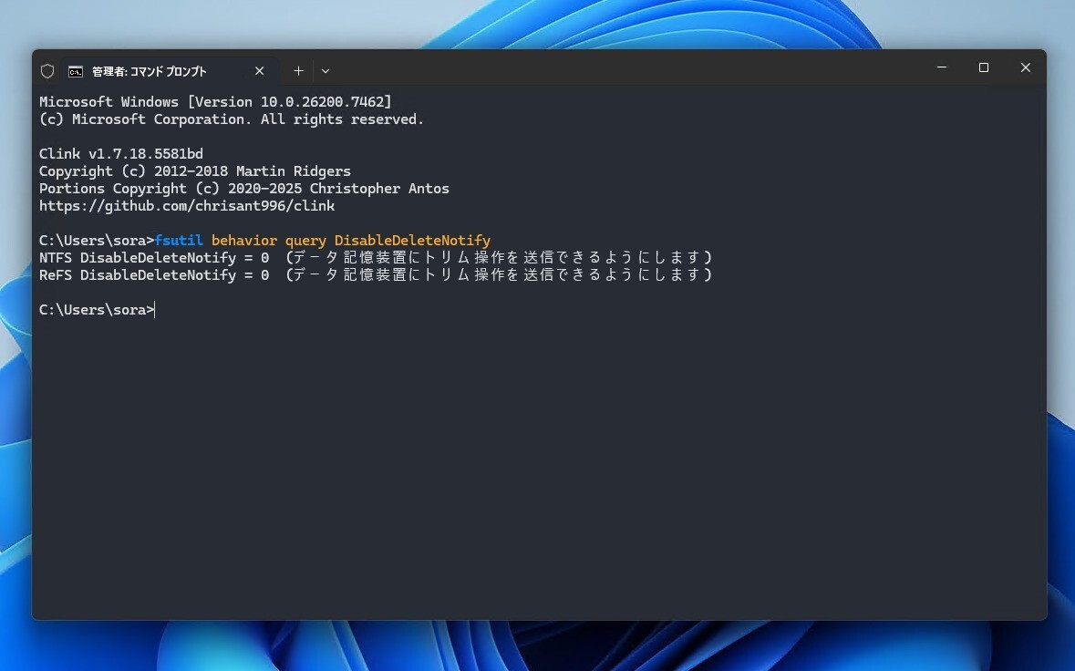 TRIM自体が有効化どうかはコマンドで確認できます。