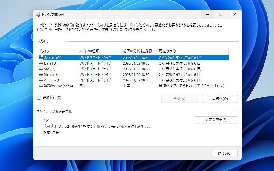 Windowsの「ドライブの最適化」はHDDでは「デフラグ」が実行されますが、SSDでは「トリム」が実行されます。最適化が実行されているか、以下の手順で確認します。