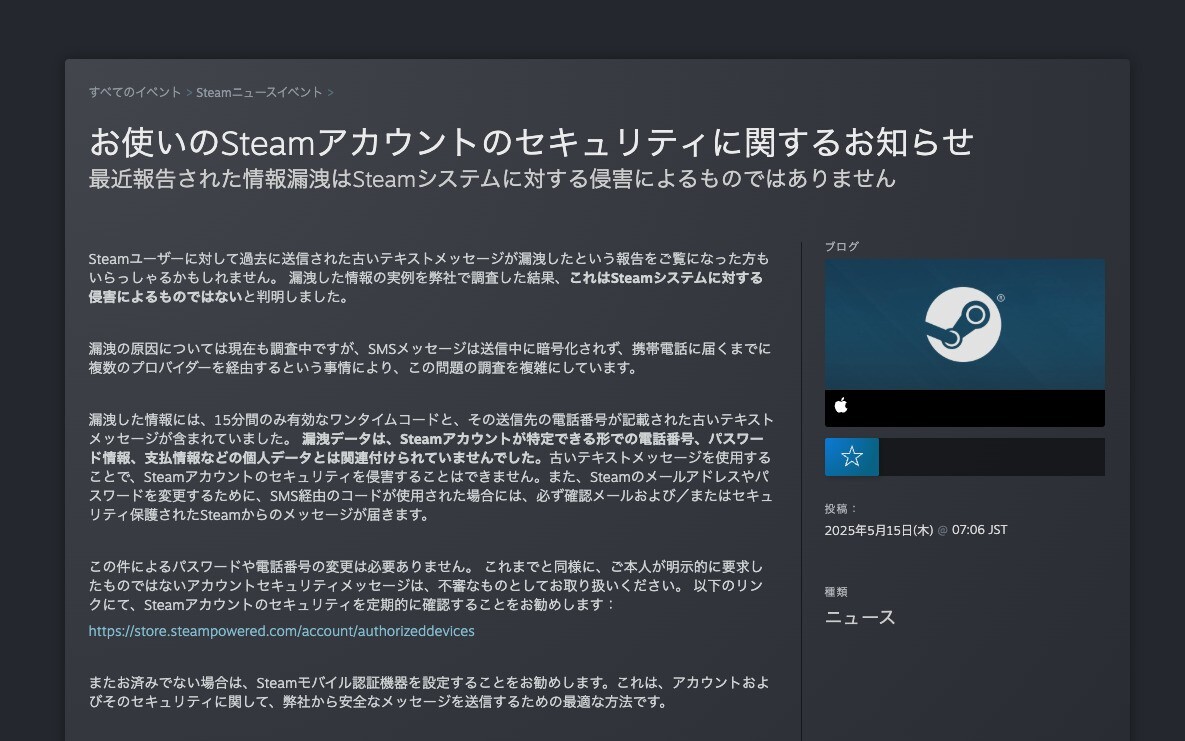 漏洩した情報には、15分間のみ有効なワンタイムコードと、その送信先の電話番号が記載された古いテキストメッセージが含まれていただけで、Steamアカウントが特定できる形での電話番号、パスワード情報、支払情報などの個人データとは関連付けられていないとのこと。