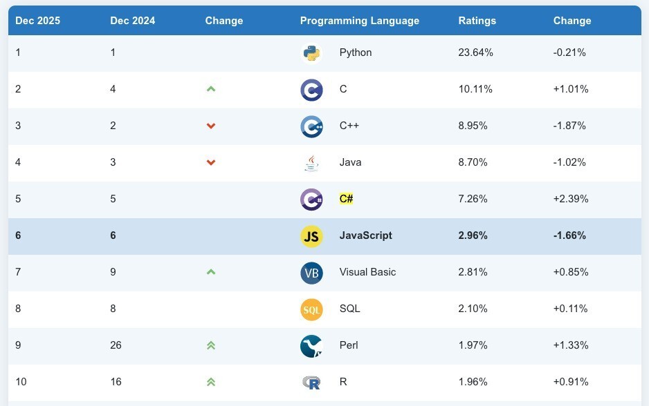 プログラミング言語の人気ランキング「TIOBE Index」の2025年12月版が発表されました。