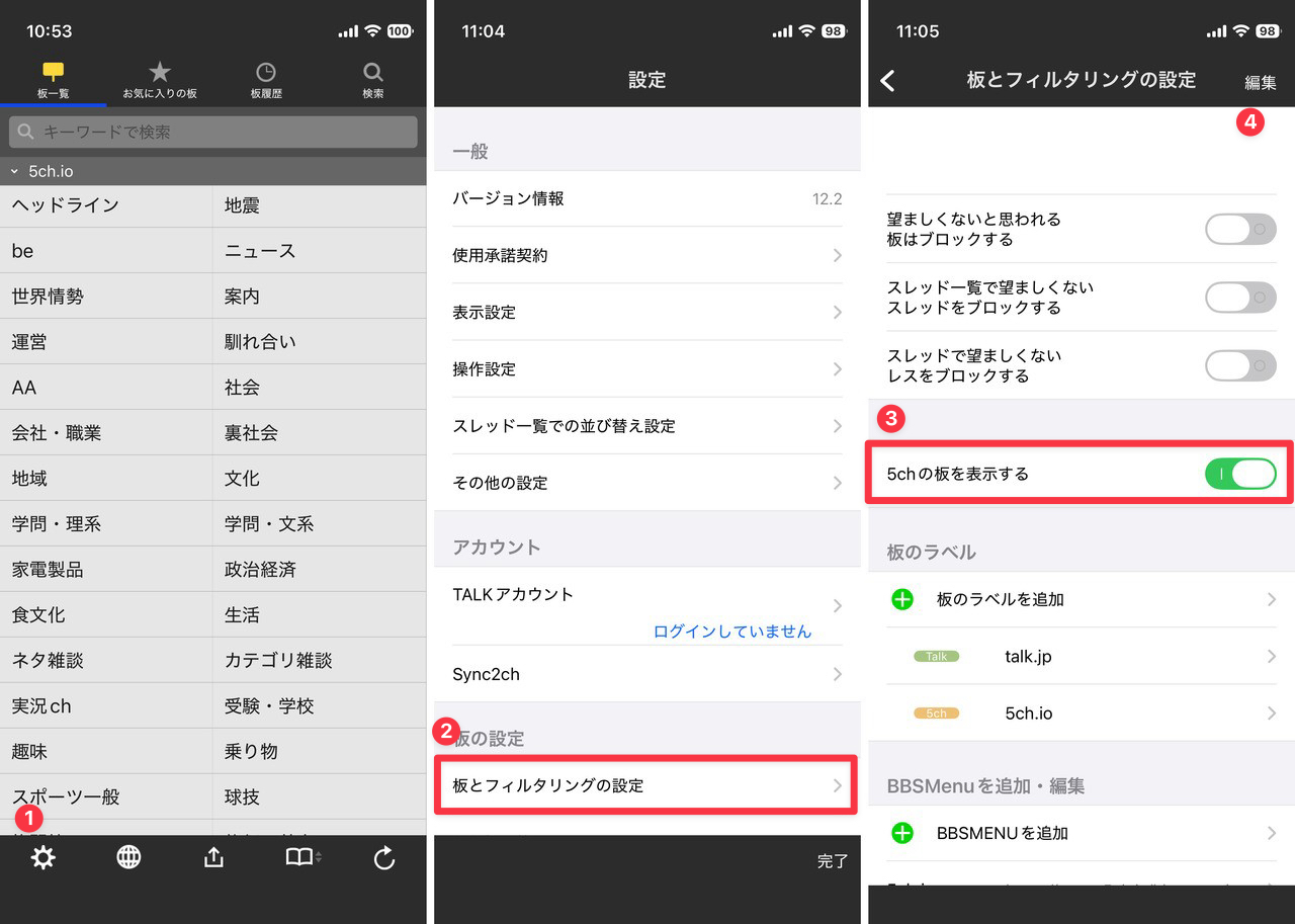 ▲「設定(歯車アイコン) > 板とフィルタリングの設定」で「5chの板を表示する」をオンに変更。暫定的に手動で5ch.ioのBBSMENUを追加していた場合、右上の「編集」をタップして削除します。