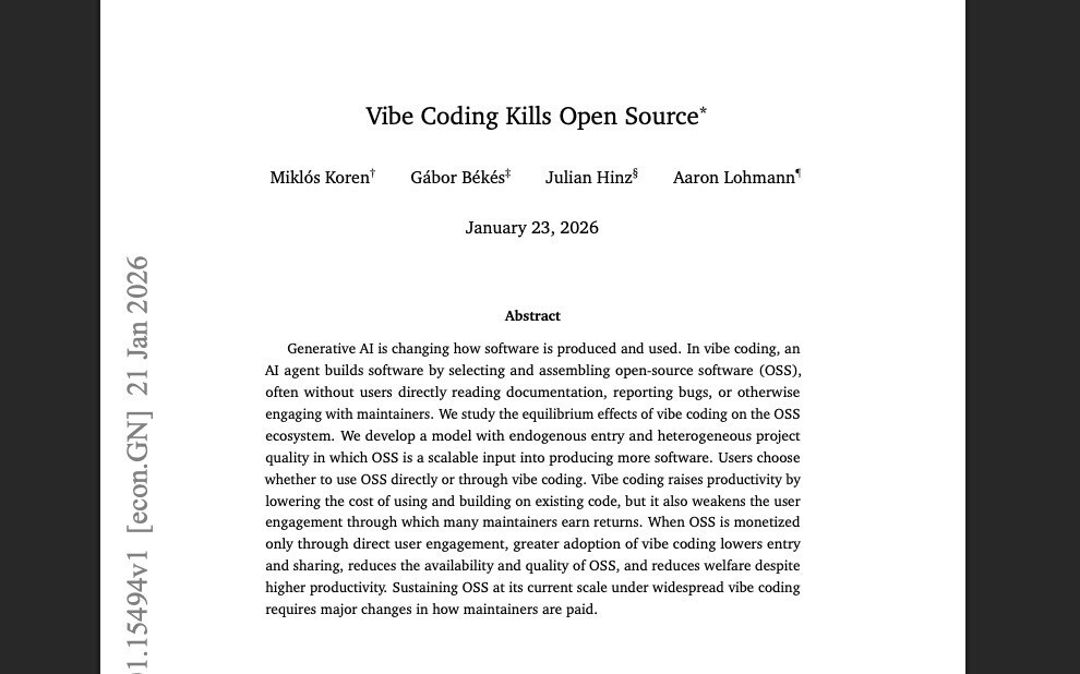 また、中央ヨーロッパ大学などの研究者による論文 「Vibe Coding Kills Open Source」は、AIがOSSに与える影響を経済モデルから分析しています。