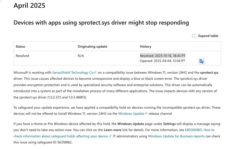 Microsoftは、互換性のない「sprotect.sys」ドライバーが動作しているデバイスに対して、Windows Update経由でWindows 11 Version 24H2が提供されないよう「互換性保留措置(safeguard hold)」を適用していましたが、最近の「sprotect.sys」ドライバーを使用するソフトウェアでは、互換性の問題が解消されたとのこと。
