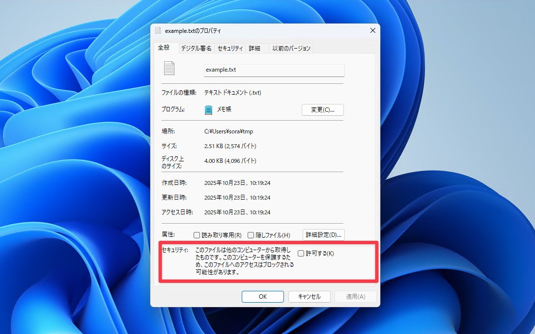 ファイルを右クリックし「プロパティ > セキュリティ」で「許可する」にチェックを入れます。