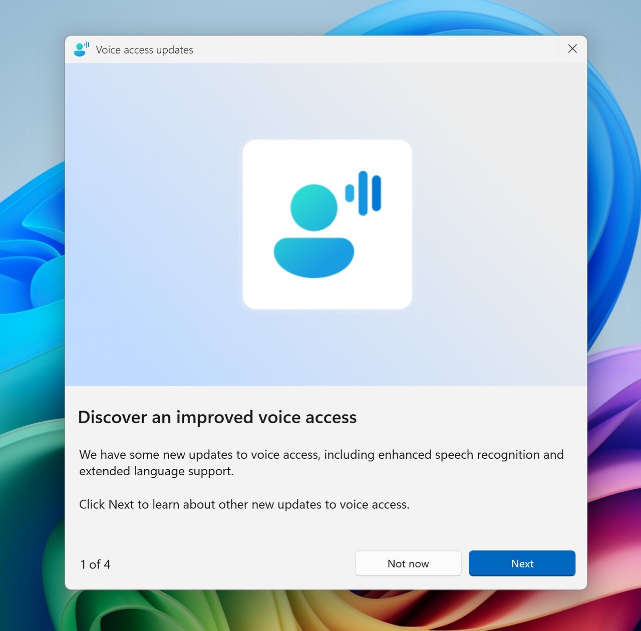 Build 27868では、音声アクセスが改善され、製品内で新機能や改善点を紹介する没入型の新しい体験をサポートしています。この体験により、音声アクセスの新機能をすばやく発見し、詳細を学び、試すことができるようになります。
