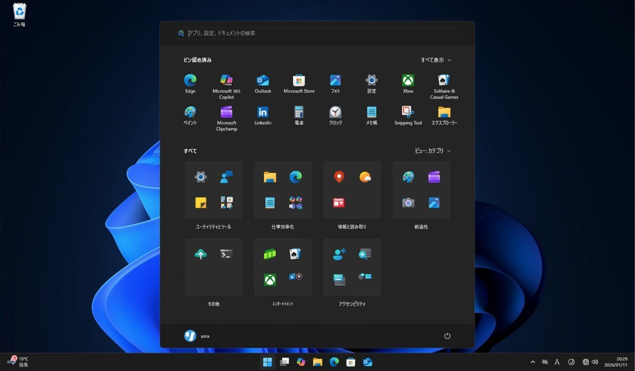 新しいスタートメニューはシングルページ構成で一覧性が向上しているのが特徴です。ピン留めアプリ、おすすめ、アプリ一覧が1ページに収まる構造となっており、クリック数が多いという従来の不満を軽減しています。