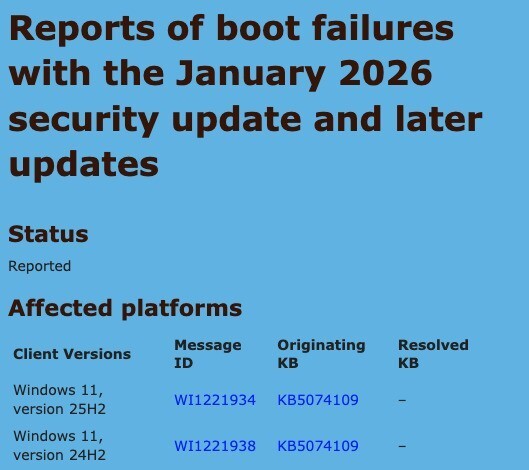 1月の月例更新プログラムではこれまで、アプリがフリーズする、アプリが起動しない、PCがシャットダウンできないといったさまざまなトラブルが報告されてきました。これらはOOBアップデートで解消済みですが、今回の不具合は PCがそもそも起動しない という、より重大なレベルのものとなっています。