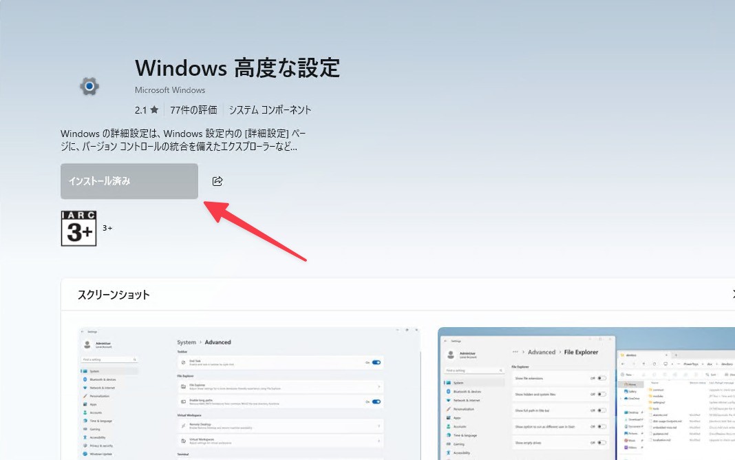 「Windows 高度な設定」という名前のアプリの詳細ページがすでに準備されており、ここでは次のようなスクリーンショットが掲載されています。