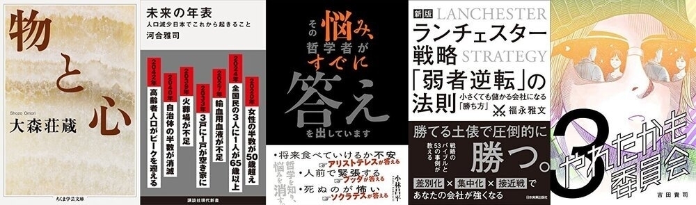 「物と心」「未来の年表 人口減少日本でこれから起きること」「その悩み、哲学者がすでに答えを出しています」など