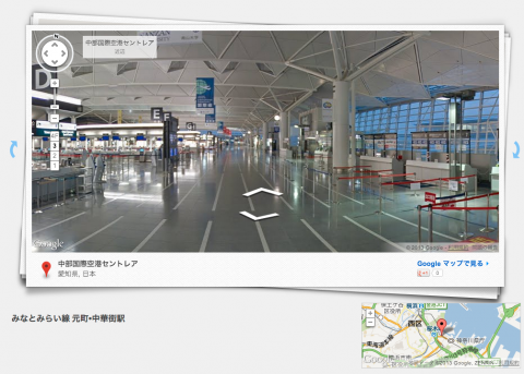 Googleの建物内部版ストリートビューが、中部国際空港セントレアや、みなとみらい駅などに対応しました(ストリートビューギャラリー、Google公式ブログ)。