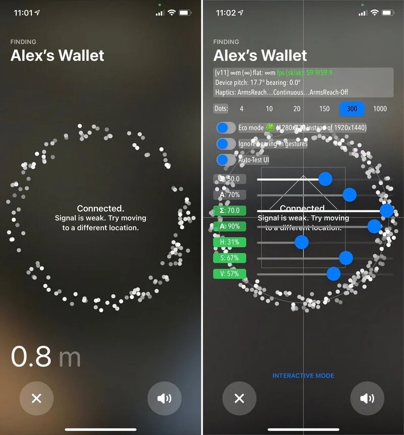 デバッグモードはiOS 14.5のほか、iOS 14.6のベータ版に搭載されていて、精密検索画面でアイテムの名前を4回タップすると有効にすることができます。隠しモードでは、加速度計やジャイロスコープの座標、触覚フィードバック、画面の解像度、トラッキングアニメーションなど各種の診断情報がリアルタイムで表示されます。