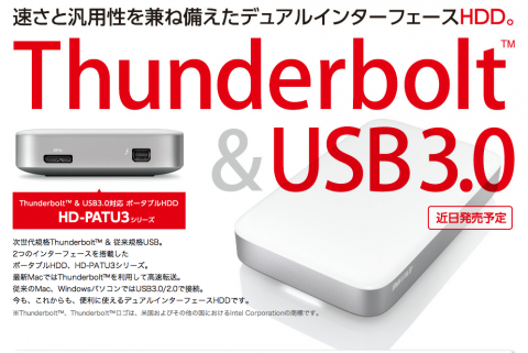 BUFFALOよりThunderboltとUSB3.0/2.0に対応したポータブルHDD「HD-PATU3」シリーズが発売予定だそうです。