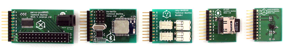 などなど。Tesselモジュールというのは「ACCELEROMETER」「MICRO SD CARD」、「RFID」、「AUDIO」、「BLUETOOTH」、「SERVOS」、「RELAYS」「TEMP + HUMIDITY」などの、Tesselの機能を拡張するための専用のボードのようです(以下の写真のようなものらしい)。