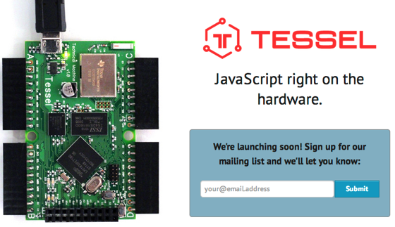 「Tessel」はJavaScriptが動くマイコンボード。現在開発中のようですが、以下のような簡単なJavaScriptコードでランプを点灯させることができるみたいです。