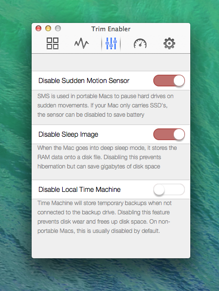 - Disable Sudden Motion Sensor: HDD用のモーションセンサーはSSDでは不要なのでそれを無効にできる。