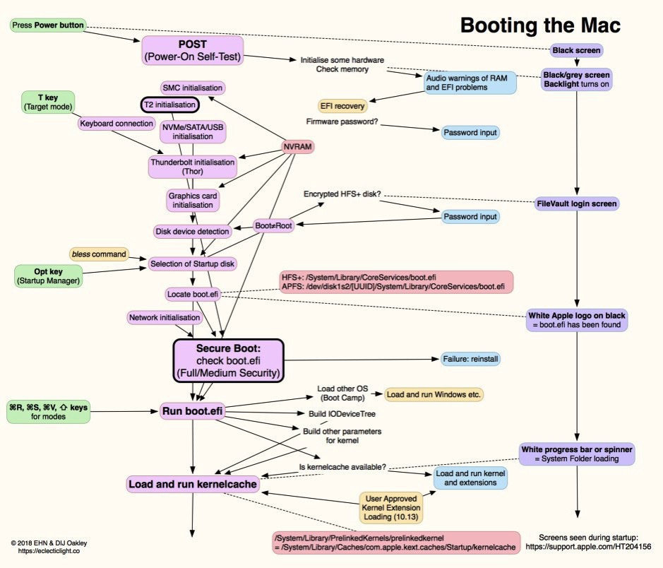 このようなmacOSの起動時の流れを詳しく知りたい方は、eclecticlight.coで公開されているブログ記事「Booting the Mac: Visual Summary」を参照すれば良いでしょう。