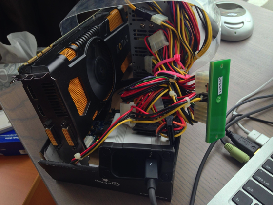 Thunderbolt経由で外部ビデオカードを使うというアイデアは、理論上は可能っぽかったのですが、実際に動かしているところを見ることはなかなかできませんでした。それをパーツを寄せ集めて実現してしまう実行力は凄いものがあります。