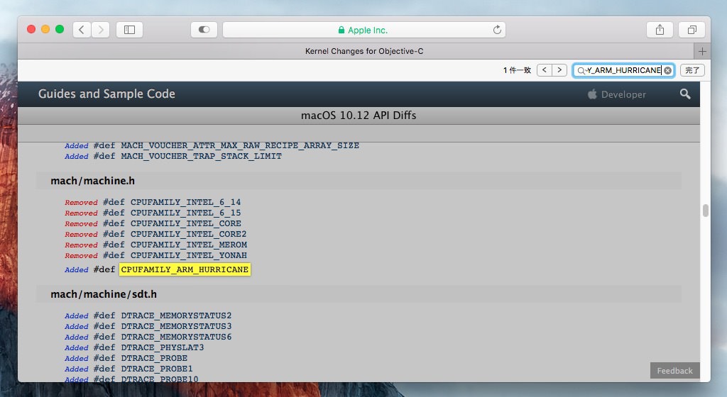 証拠はオランダの小売店、TechTastic.nl[英語翻訳]によって発見されたもの。実際にmacOS SierraのAPIの変更点を解説する開発者向けページを確認すると、いくつかのIntel CPUファミリー向けの定数定義が削除されるとともに、ARM Hurricaneファミリーに関する定義が新たに追加されていることが確認できます。