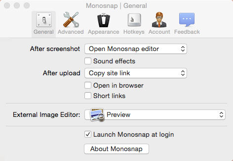 「General」タブ。常時使いたい場合「Launch Monosnap at login」選んでおくと良いでしょう。キャプチャ後に開くアプリや、(アップロードする場合は)アップロード後の処理を設定することもできます。