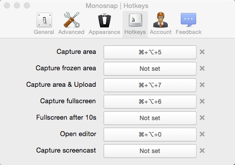 「Hotkeys」タブ。キャプチャに使うショートカットキーを設定します。「Capture area」が通常のキャプチャに使うショートカットキーです。「Capture area & Upload」だと、キャプチャ後自動アップロード処理が動きます。