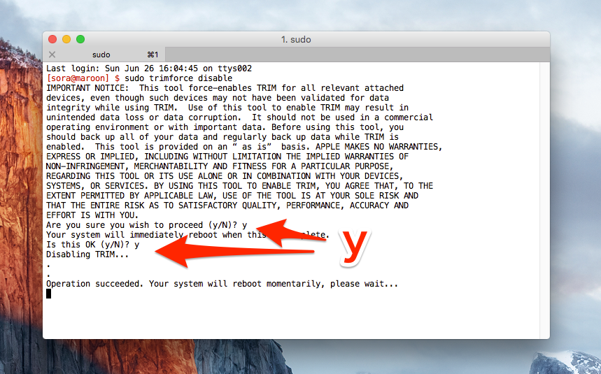 もし何らかの不具合が発生してTrimを無効化したい場合、ターミナルから「sudo trimforce disable」」と打ち込みます。有効にする場合と同じく2回「y」を打ち込み、しばらく待つと再起動してTrimが解除されます。