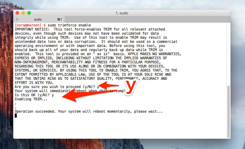 trimforceコマンドでTrimを有効化するには、ターミナルを開き「sudo trimforce enable」と打ち込みます。「Trimを有効化することでデータをロストしたり破損したりする危険性がある」という趣旨の警告文が表示されますので、自己責任にて「y」を打ち込み有効化します。もう一度「y」を打ち込むと再起動して、Trimが有効となります(再起動するまで1〜2分ほどかかります)。