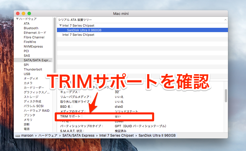 メニューバーのAppleマークをクリックし「このMacについて > システムレポート > ハードウェア > SATA/SATA Express」と進み、TRIMサポートが「はい」になっていればTrimが有効となっています。