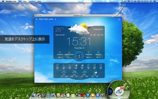 「気象ライブ」はあらかじめ登録しておいた地域の気象情報を美しいアニメーションとともに表示してくれるアプリです。リサイズ可能なメインウィンドウに情報を表示する以外にも、メニューバーやDockに天気、気温を表示することもできるので、邪魔になりません。