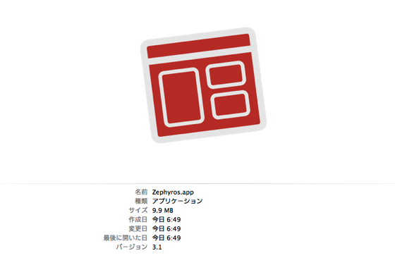 About ZephyrosのDownloadから、Zephyros-LATEST.app.tar.gzをダウンロードします。展開してZephyros.appを開いて実行するとメニューバーにアイコンが表示されます。