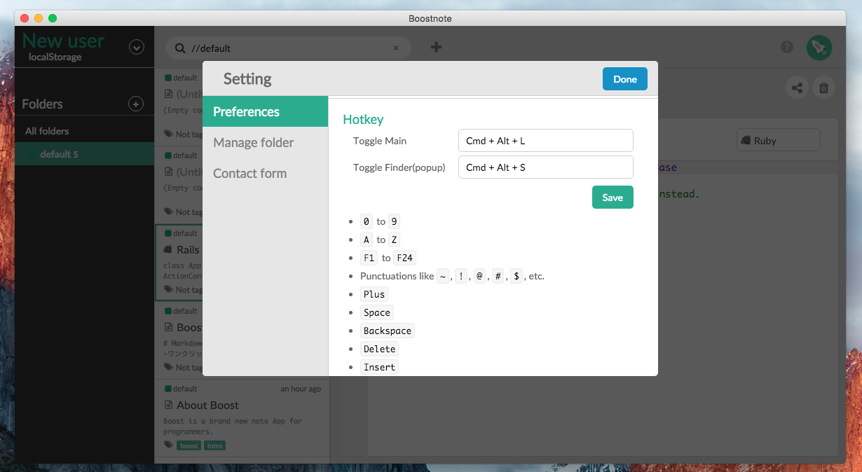 ▲アプリで使用できるホットキーは設定画面で確認することができます。例えばToggle Finderに設定されている「Cmd + Alt + S」をタイプするとBoostnoteの特徴でもあるFinderウィンドウを表示することができます。