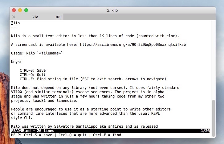 git clone https://github.com/antirez/kilo.git cd kilo.git make ./kilo README.md