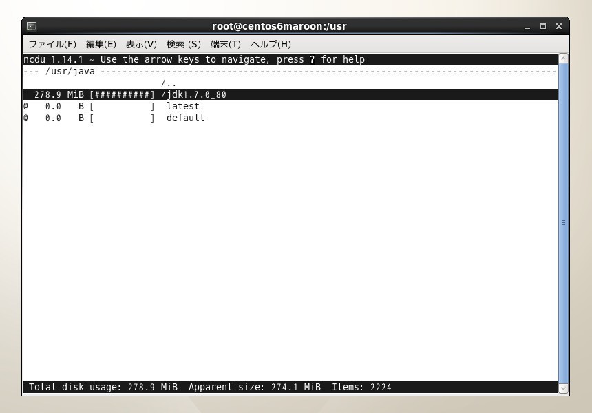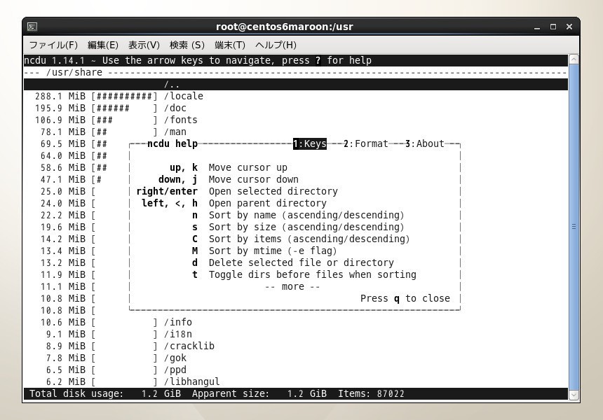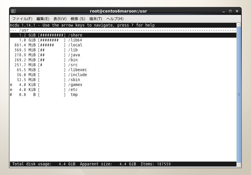 「ncdu」を引数なしで実行するとカレントディレクトリ以下が、「ncdu /usr」のようにディレクトリを指定するとそのディレクトリ以下が対象となります。