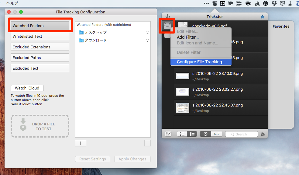 設定画面では「Watched Folders」が一番重要です。この中に含まれるファイルが表示対象となるためです。例えばデスクトップや、ダウンロードフォルダを設定しておきます。