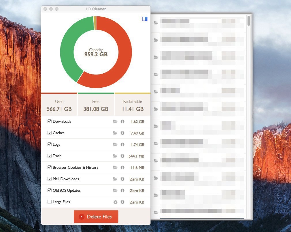 フォルダを指定してスキャンすると、ダウンロードファイルや、キャッシュなど、削除してもよさそうなファイルをリストアップしてくれます(グラフの黄土色の領域)。その後「Delete Files」をクリックすると実際に不要なファイルを削除することができます。ディスクの空き容量不足に悩んでいる方はどうぞ。